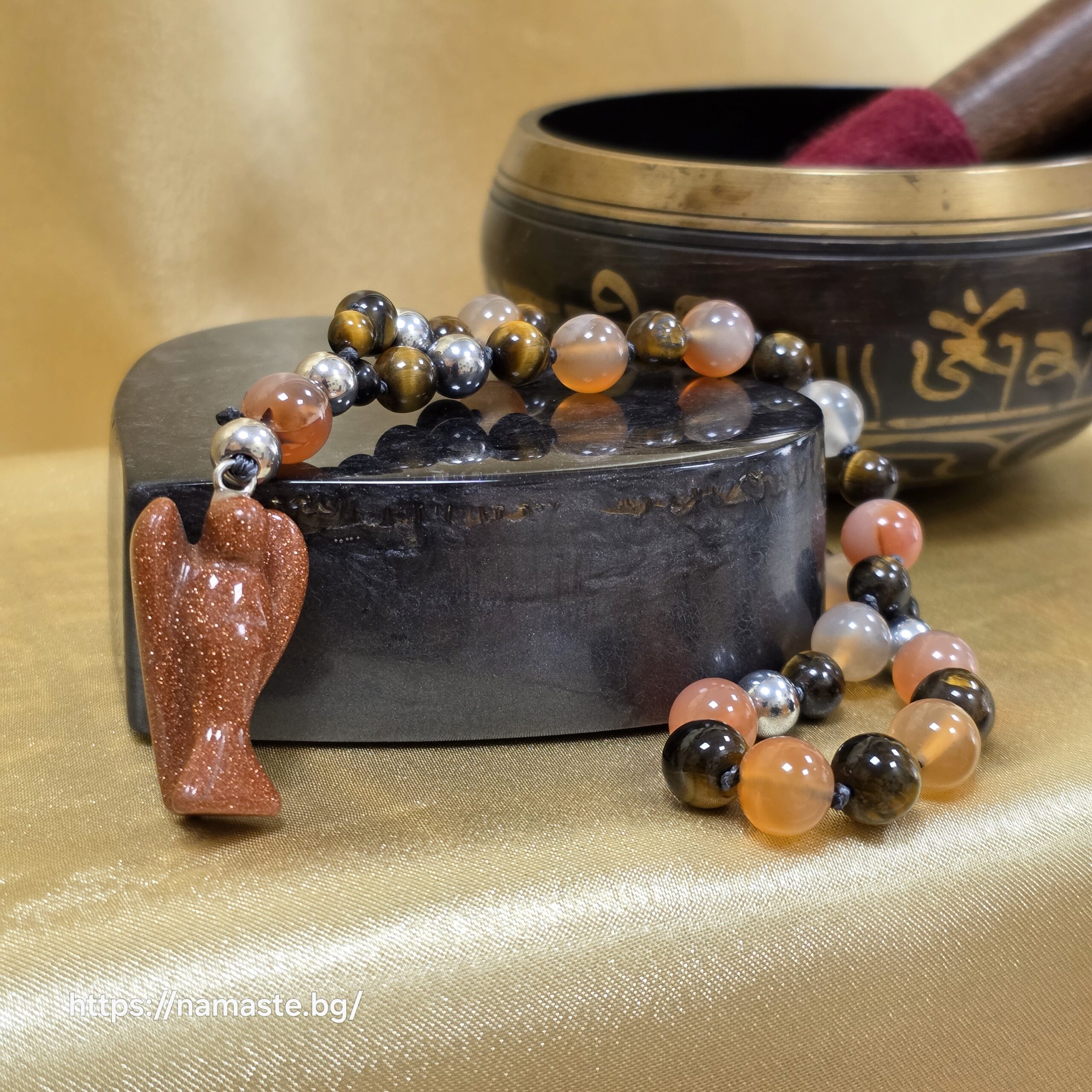 Слънчевият камък е смятан за дар от божествата на Слънцето, тигровото око е било пазител в битки, а ахатът – защитник на бременни жени. В съчетание с хематита тази броеница носи не само древна сила, но и ангелска мекота.