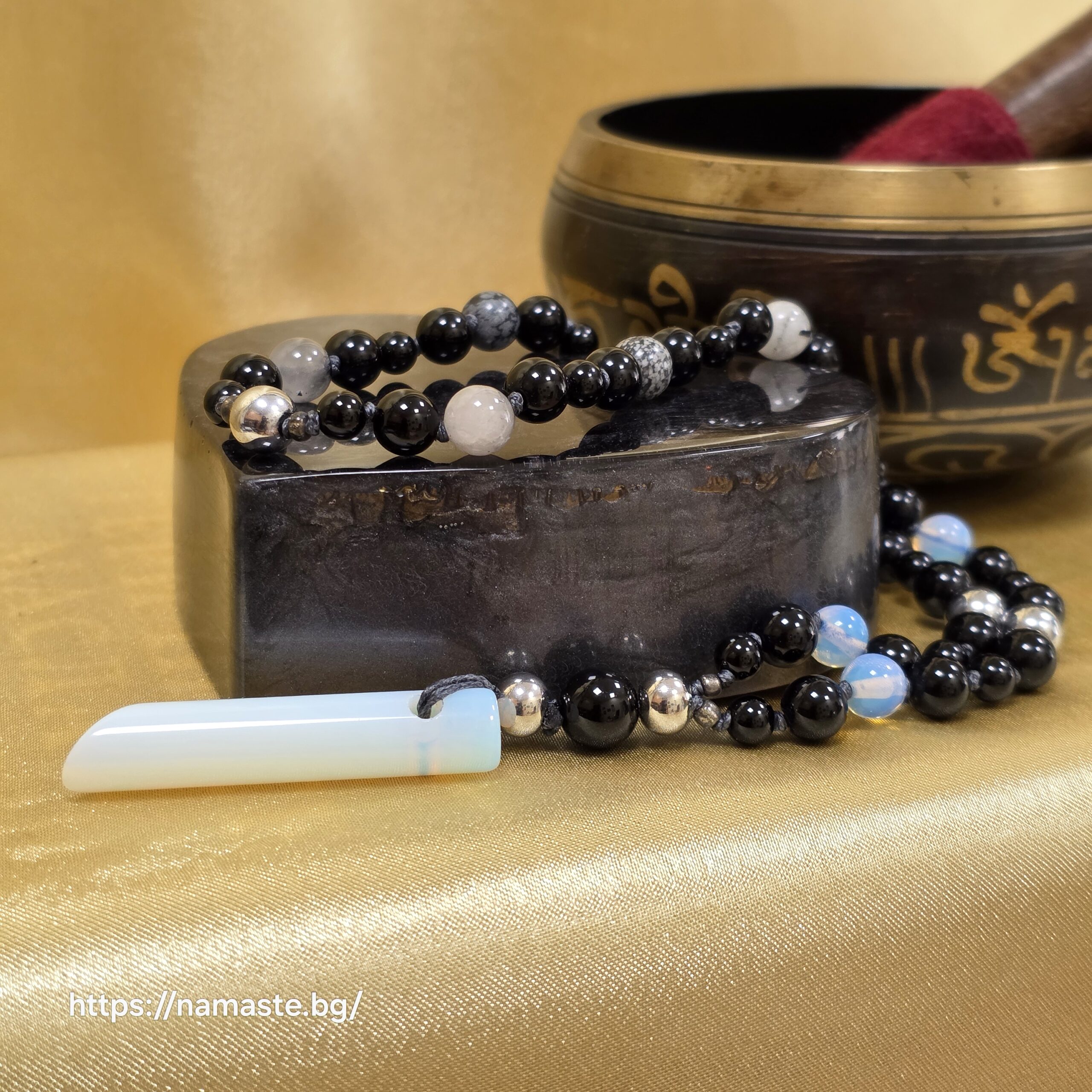Съчетавайки черния оникс, магнитния хематит, сияйния опал, косите на Венера и сиво-черния обсидиан, тази броеница носи усещане за заземяване, баланс и връзка с тайнственото.