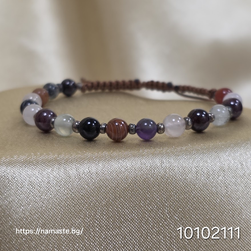 „Хармония на петте сили“ е изящна гривна, която обединява в едно пет свещени камъка, почитани от хилядолетия – аметист, розов кварц, оникс, карнеол и флуорит. Всяка перла носи собствена вибрация и сила, но заедно те образуват хармоничен кръг, който съчетава защита, любов, яснота, жизненост и стабилност. Това е гривна, която не просто украсява китката, а се превръща в личен енергиен съюзник по пътя на вътрешната трансформация.