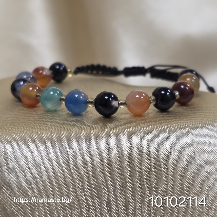 е енергийна гривна с цветен ахат – хармония и защита чрез петте елемента. Ръчно изработена от Аш‘Тара, програмирана с космоенергийна настройка.