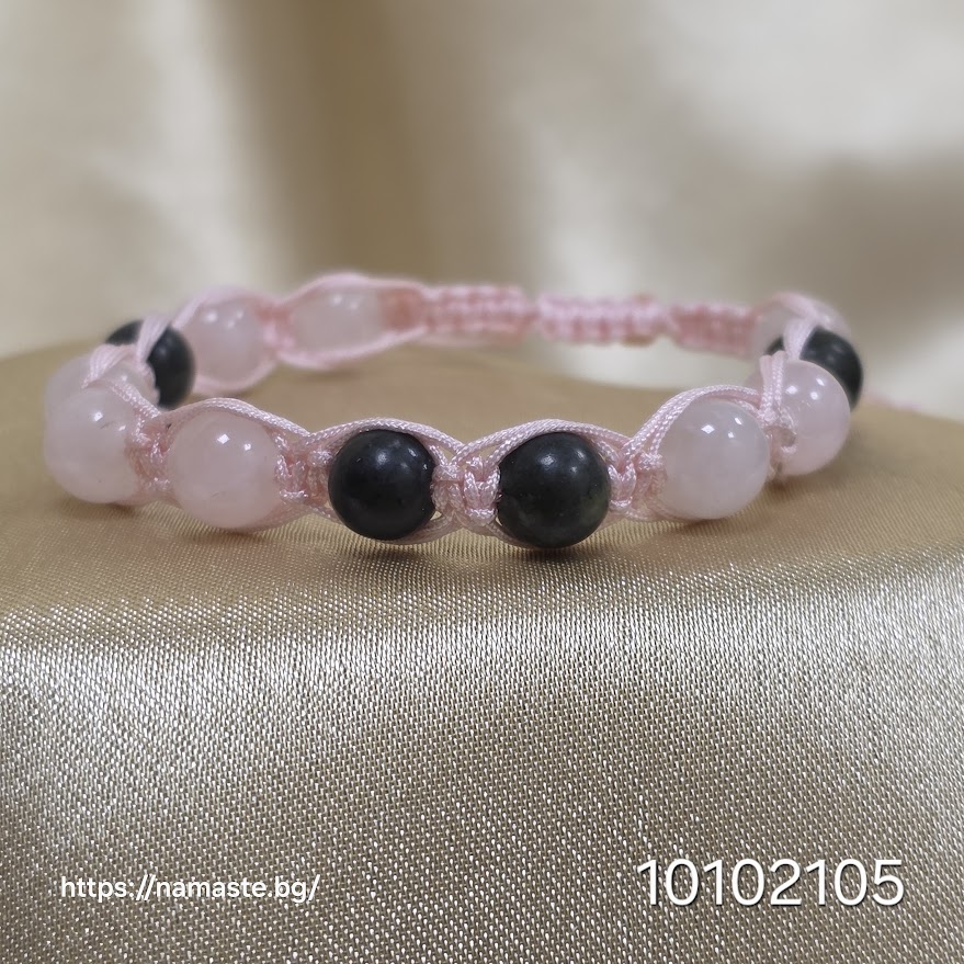 Материали: Естествен розов кварц, зелен жадеит, ръчно плетен розов шнур.