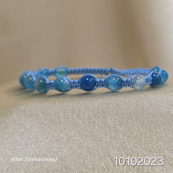 „Шепотът на океана“ е гривна, която пренася душата в свят на тишина, плавни вълни и безкрайна синева. Всяко мънисто от син ахат е като капка от морска дълбина – носи със себе си силата на водния елемент, който пречиства, успокоява и хармонизира. Синьото е цветът на мира, на откритото небе и на дълбоката вода, която пази в себе си тайните на живота.