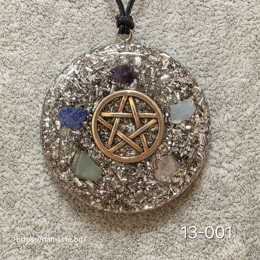 Петте лъча на пентаграма в този оргонит са акцентирани с полускъпоценни камъни и минерали с различна насоченост – аметист (най-духовният камък, за връзка с Висшите сили – носи мъдрост, пази от енергийни намеси и зависимости), лазурит (камък-вдъхновение насочва енергията в правилната посока за постигане на амциозни цели и мечти), зелен авантюрин (насърчава позитивността и помага за облекчаване на стари емоционални рани. Защитава и лекува сърцето и носи емоционален покой), розов кварц (камъкът на Любовта, носи нежност, прошка, състрадание, доброта, толерантност и вътрешен мир.) и амазонит (камък за увеличаване на смелостта, помага при съмнения в себе си, несигурност, ниско самочувствие или липса на доверие в собствените способности, умения или таланти).